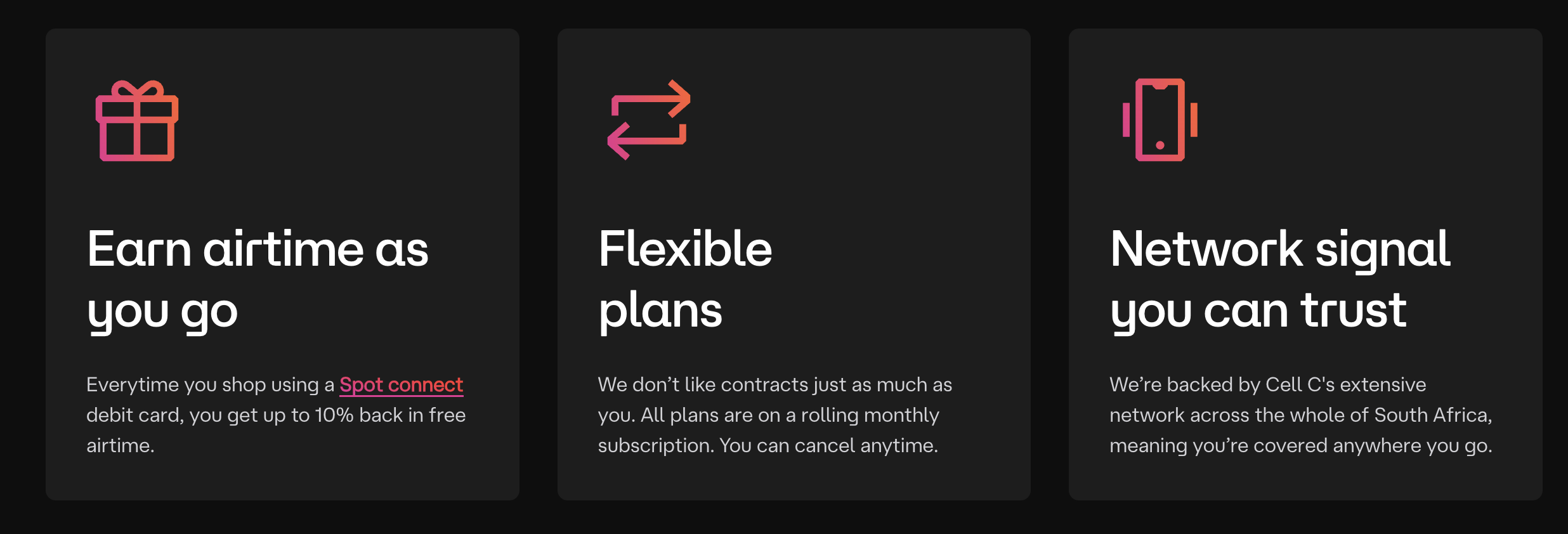 Spot Connect runs on the Cell C network, so you'll get reliable coverage and call quality.